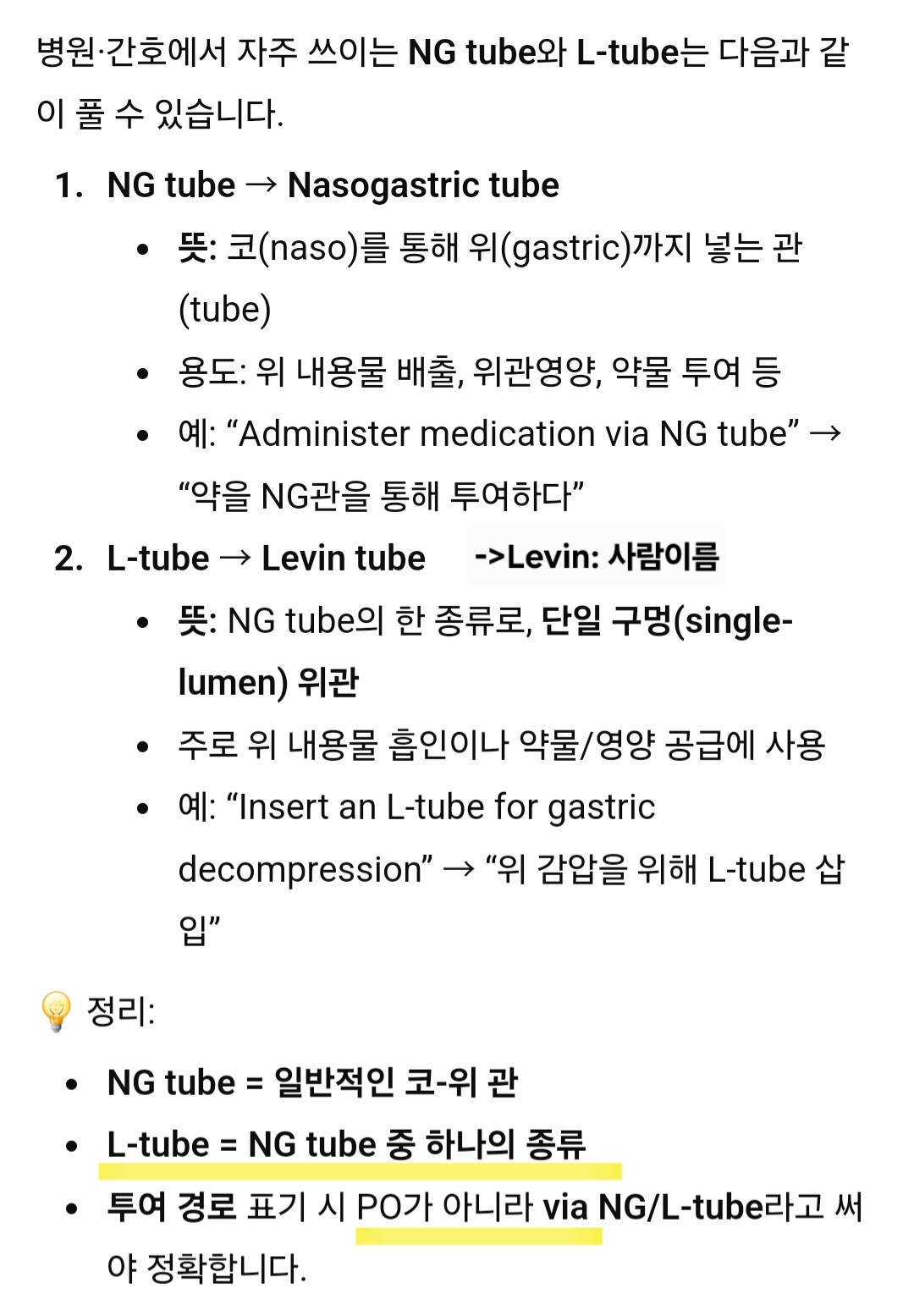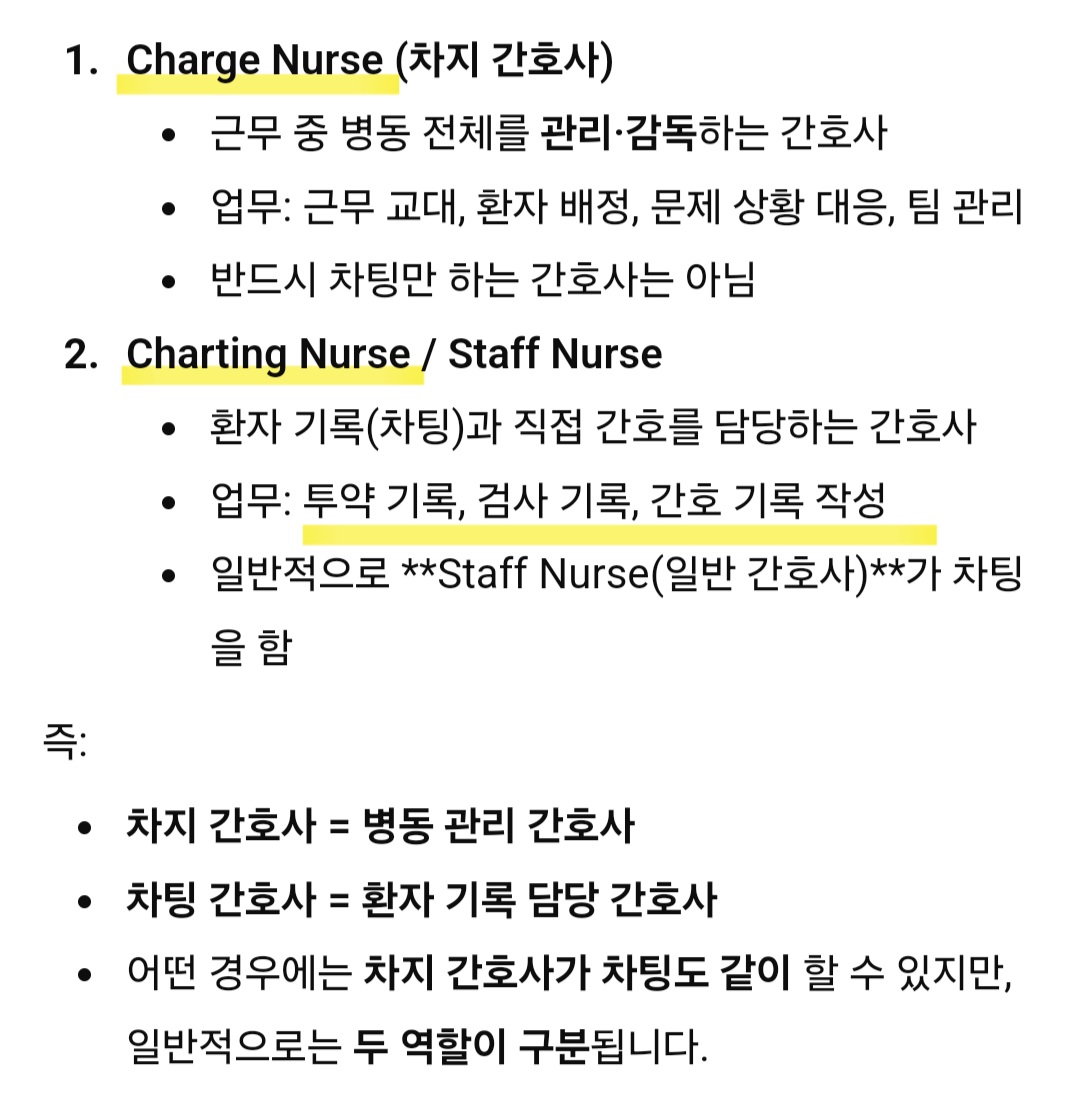 Charge Nurse → 근무 교대 중 병동을 관리하는 간호사