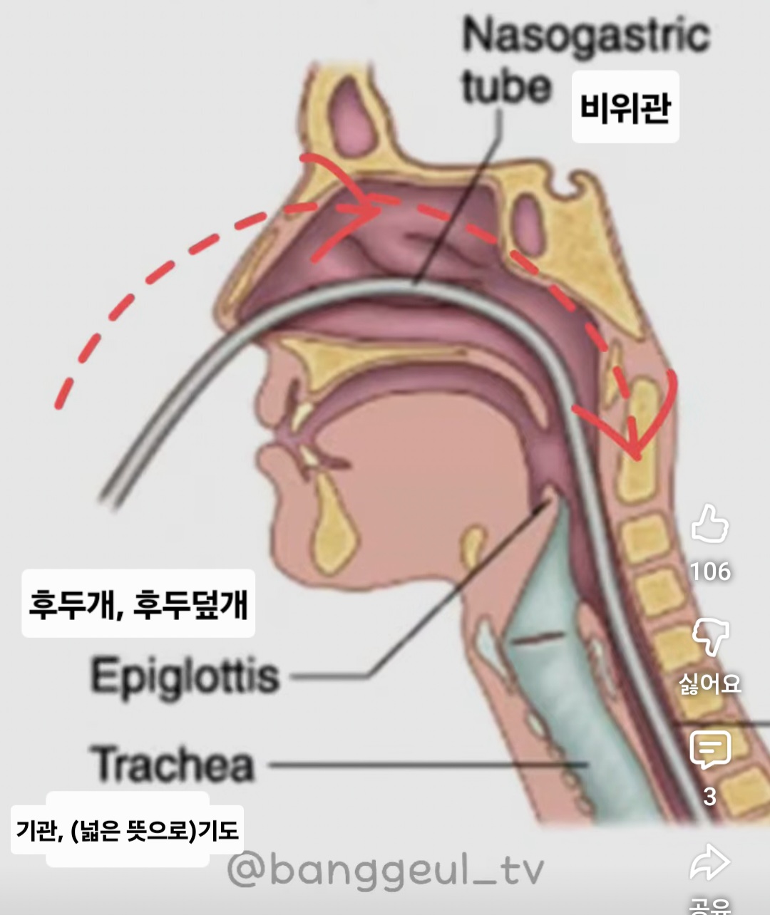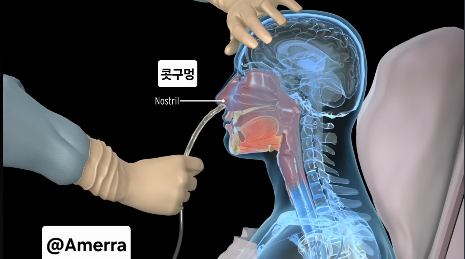 튜브 비인두 도달 → 고개 앞으로 숙인 후 침 삼키거나 물 삼킬 때마다 튜브 밀어 넣음